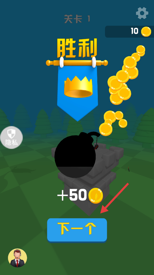4、胜利后获取金币奖励,点击“下一个”按钮,挑战后续关卡。