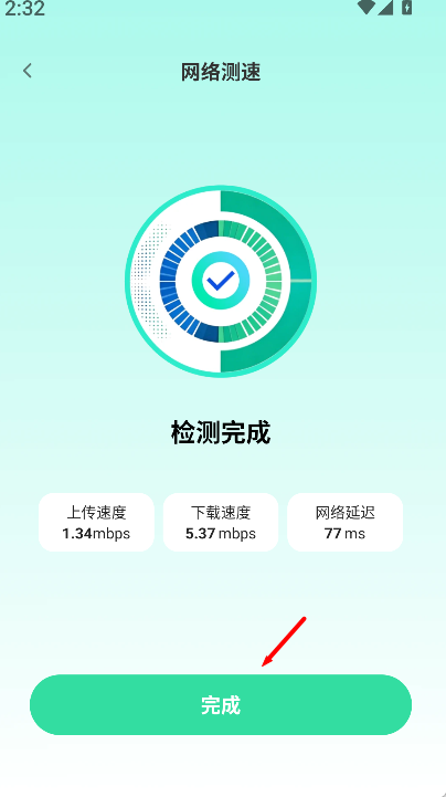 3、测速结束后,页面会显示测试结果,上传速度为1.34Mbps,下载速度为5.37Mbps,便于了解当前网络性能状况。