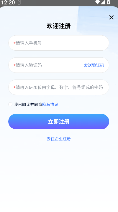 3、按照页面提示输入手机号码、验证码及密码,确认后提交信息,系统验证完成即可成功注册并进入主页面。