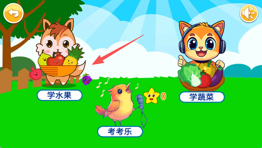 3、具备互动检验功能,点击考考乐,可参与互动环节,检验对蔬菜水果、交通工具等内容的认知情况。