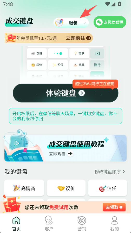 《成交输入法》可选择行业,适配房地产、服务业、教培等多个领域,推荐符合行业的话术。能自定义客户沟通场景,生成签单、产品介绍、售后维护等精准话术,还可修改键盘排序或添加键盘。开启权限后,在微信等聊天场景能一键切换键盘,搭配高情商、议价等键盘,辅助高效沟通,提升成交效率。