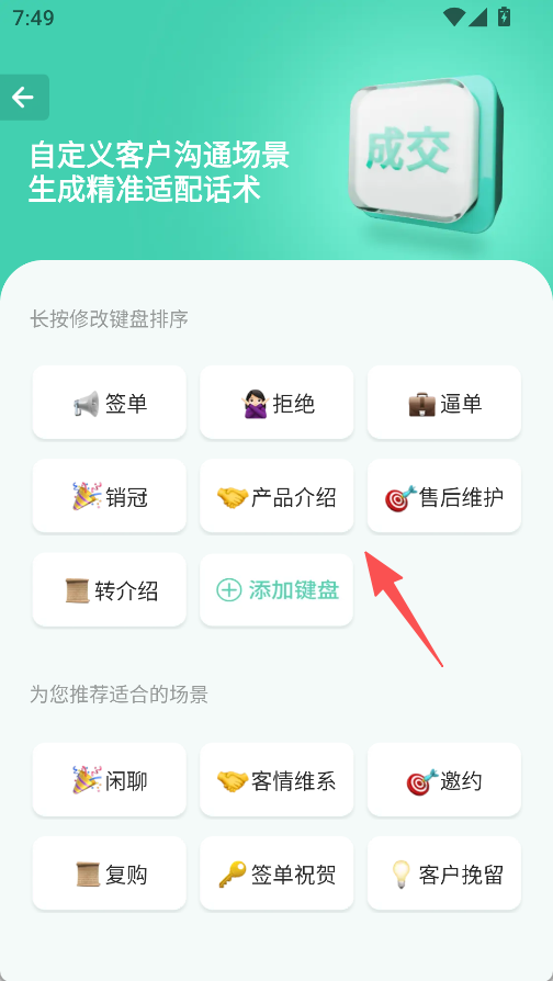 2、自定义客户沟通场景,生成签单、产品介绍等精准话术。
