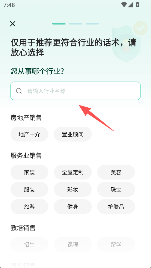 1、进入行业选择界面,输入或选择所属行业,获取符合行业的话术推荐。