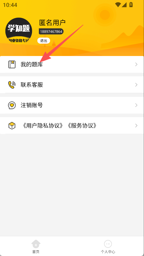 1、进入个人中心,点击我的题库。