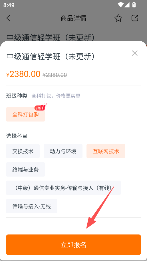 3、实现报名功能,点击立即报名即可完成课程选定,助力通信工程师备考。