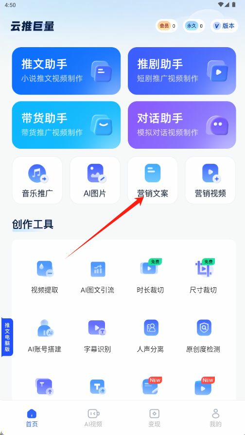 1、在软件首页浏览“创作工具”区域,找到并点击“营销文案”功能图标。