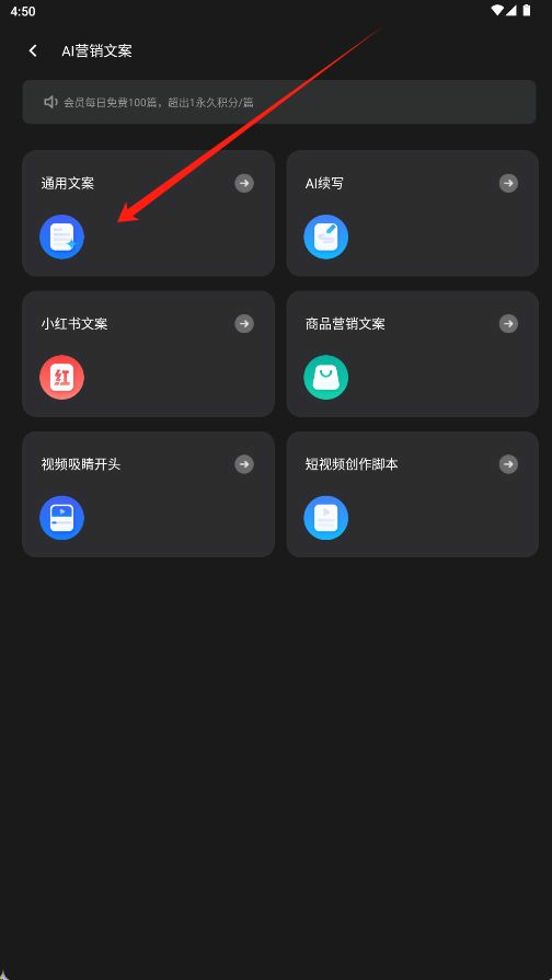 2、进入“营销文案”页面后,在多个文案类型中选择“通用文案”模块。
