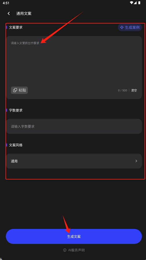 3、在“通用文案”编辑界面输入文案要求、字数及风格后,点击底部生成文案”按钮即可获得内容。