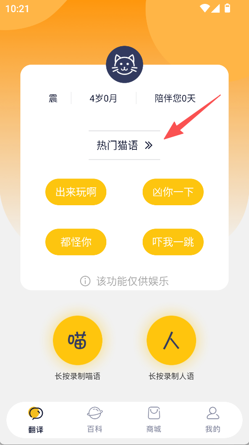 1、具备热门猫语和猫语大全功能,提供多种猫语选项,适配不同猫咪互动场景。
