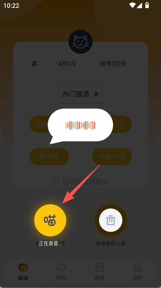 2、支持长按录制喵语功能,可录制人语转化互动,实现人与猫咪的语音交流。
