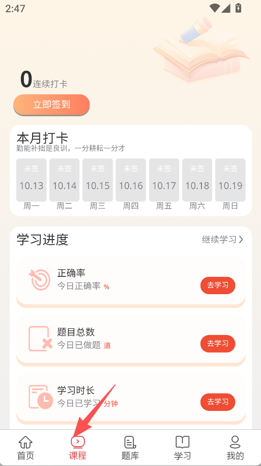 1、打卡学习体系完备,可记录正确率、题目总数、学习时长等学习进度,利于规划学习。