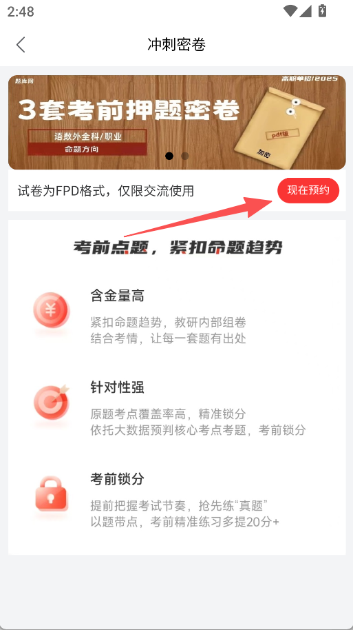 3、进入冲刺密卷页面,点击现在预约,获取考前押题密卷。