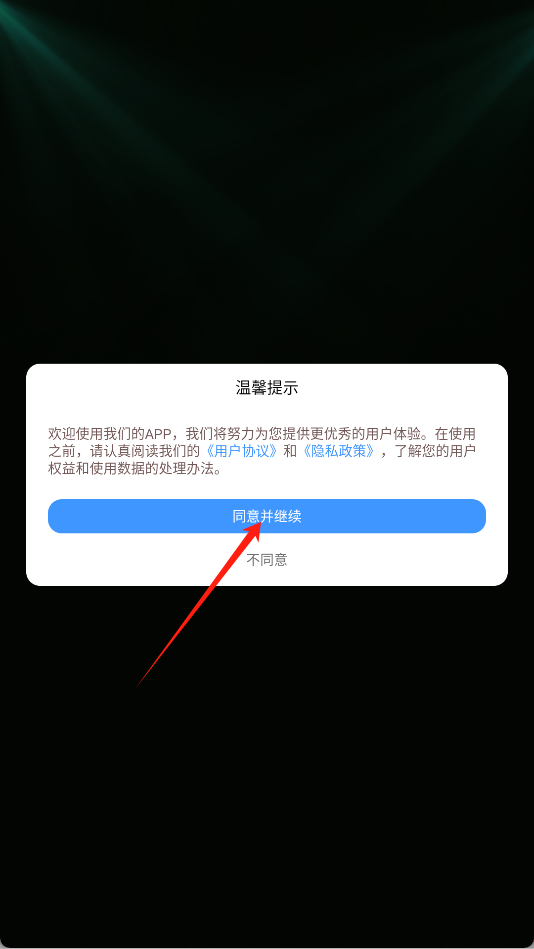 1、首次打开软件,在温馨提示弹窗中点击“同意并继续”按钮完成。