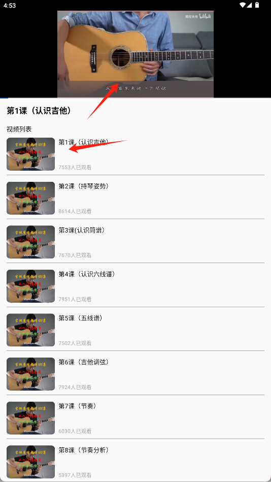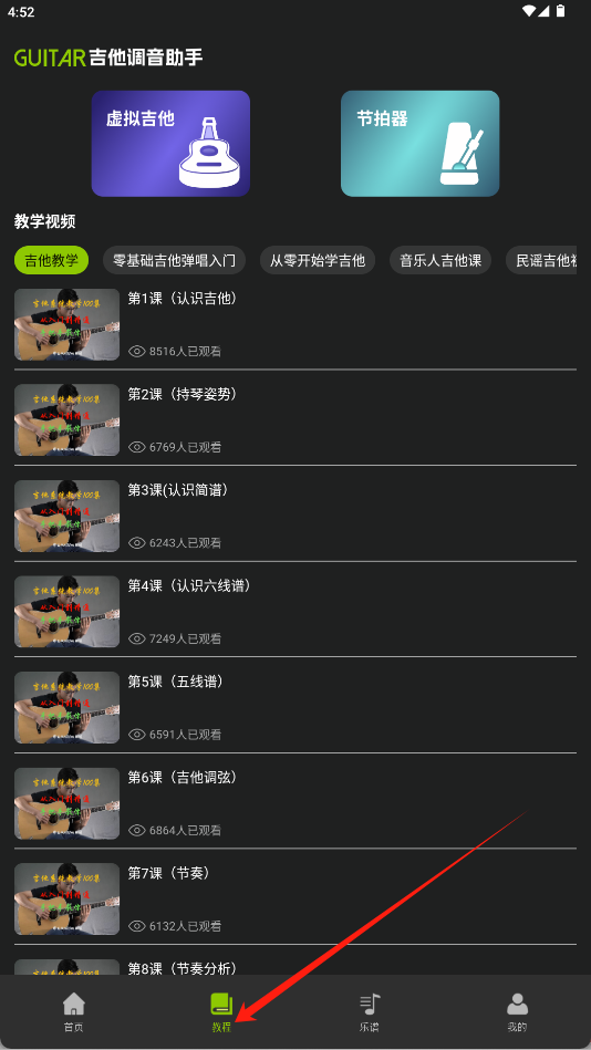 《Guitar吉他调音助手》是一款集调音与教学于一体的吉他学习工具。软件以深色界面为主,顶部突出虚拟吉他与节拍器两大核心功能。教学视频板块分类清晰,涵盖零基础入门到进阶课程,每课标注学习人数分为首页、教程、乐谱、我的四大模块。通过精准的调音辅助与系统的视频课程,帮助初学者快速掌握吉他基础知识,提升学习效率。