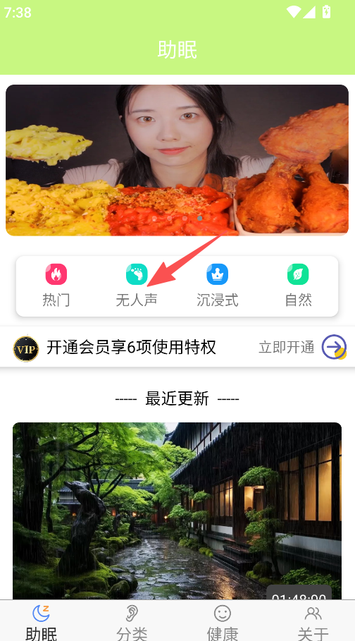 1、聚焦助眠领域,划分热门、无人声、沉浸式、自然等音频分类,融合健康科普板块。