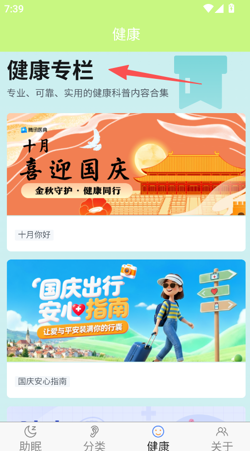 2、设有健康专栏板块,可查看国庆出行健康指南等专业科普内容,获取实用健康知识。