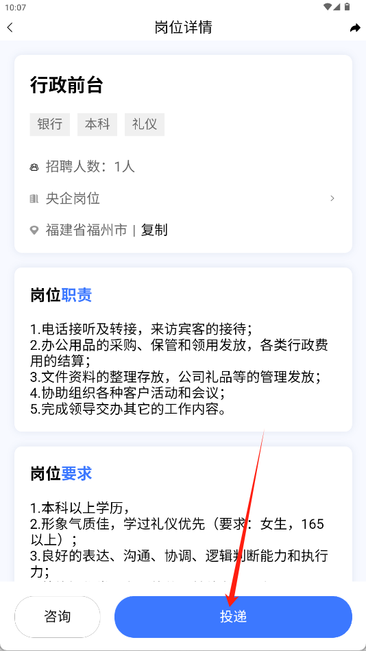 3、在岗位详情页查看职责要求后,点击底部“投递”按钮即可提交申请。