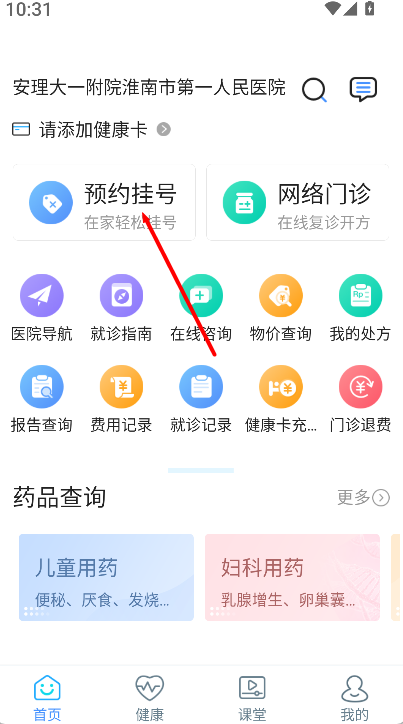 1、进入首页后,可选择挂号入口,按科室、医生、就诊时间等条件进行线上预约挂号,轻松完成就诊安排,减少现场排队等候。