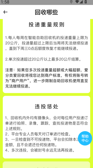 4、查看“投递重量规则”和“违投惩处”栏目,可了解各类投递重量限制及违规处理措施,规范分类回收行为