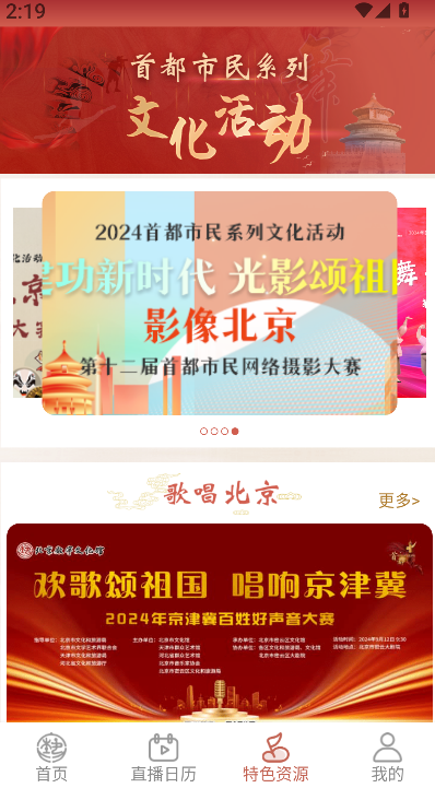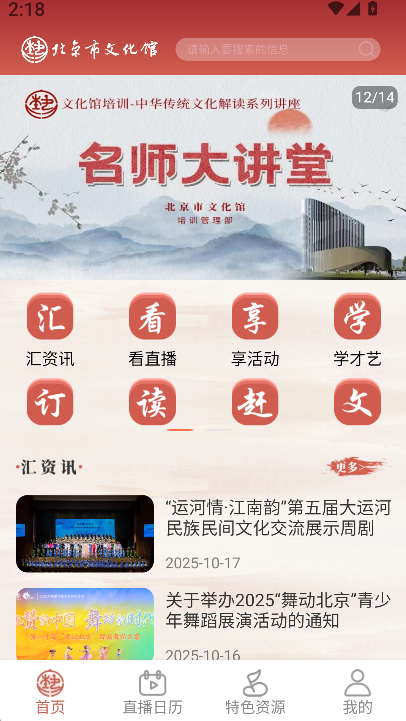 3、在“特色资源”板块中,可浏览首都文化系列活动,涵盖非遗展示、艺术展览及文化讲座,展现北京地区丰富的文化特色与艺术风采。
