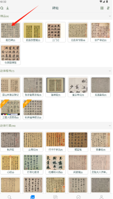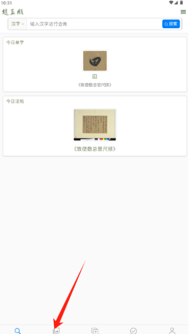 1、在应用首区域浏览推荐内容,点击底部导航栏的第二个图标书法缩略图。