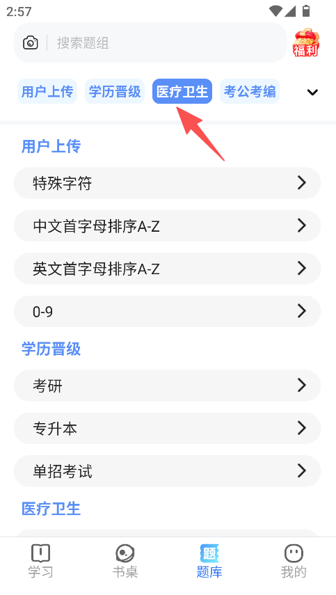 1、支持板块选择,可在医疗卫生、学历晋级等板块中选择,进入对应领域的学习和刷题界面。