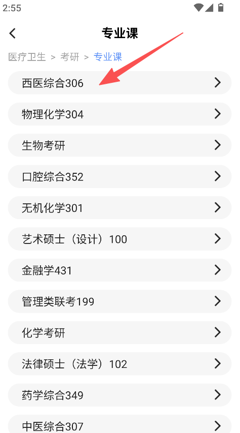 2、提供专业课选择,在医疗卫生板块下可选择西医综合306、中医综合307等专业课,开展针对性刷题。