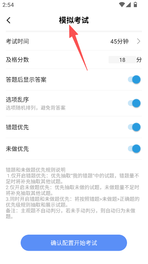3、模拟考试设置灵活,可自主配置考试时间、及格分数等,还能设置选项乱序、错题优先等,模拟真实考试场景。