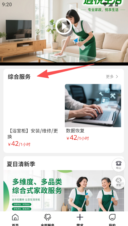 1、选择综合服务或家政板块,找到所需服务。