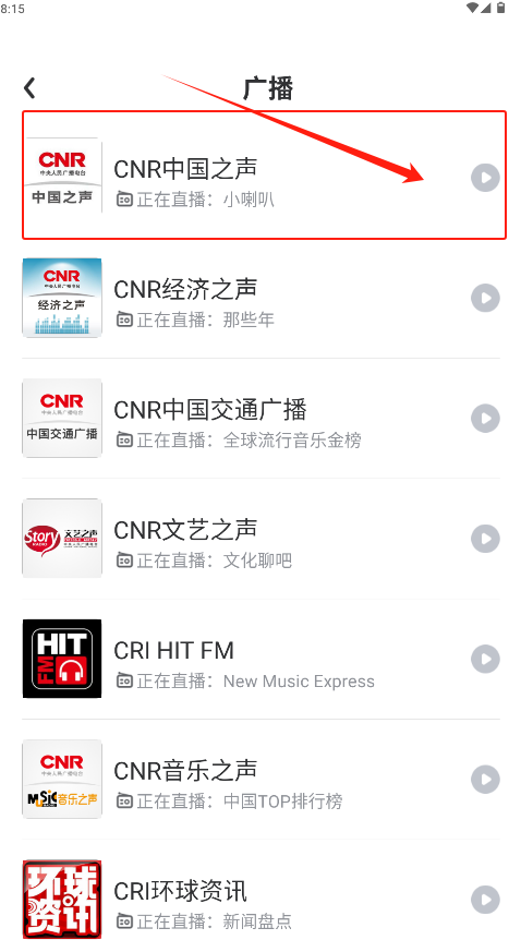3、在广播页面选择如“中国之声”或自己关注的广播新闻,点击右侧"播放键"即可进入收听。