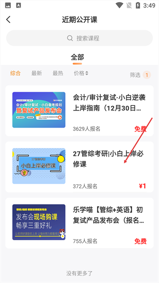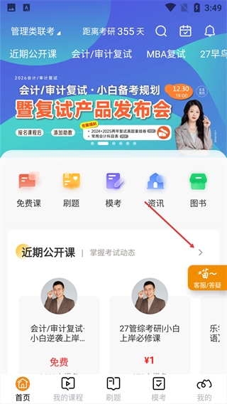 1、进入APP首页,找到【近期公开课】模块右侧的箭头按钮。