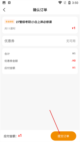 4、核对课程及应付金额后,点击【提交订单】按钮,完成该课程的报名流程。