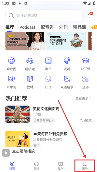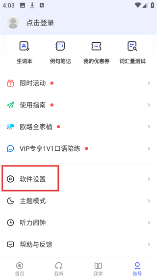 1、在软件首页,点击【听单词】选项,进入听单词板块页面。