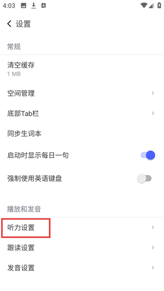 3、进入设置页面后,在【播放和发音】分类下找到【听力设置】选项。