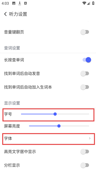 4、进入听力设置页面后,可调节【字号】的滑块,也能点击【字体】选项来设置显示字体。