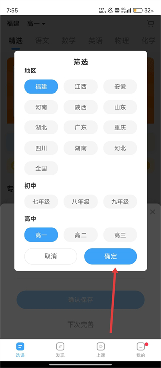 1、我们先在筛选界面选择对应地区和年级,选好后点击【确定】,就能精准匹配课程啦。