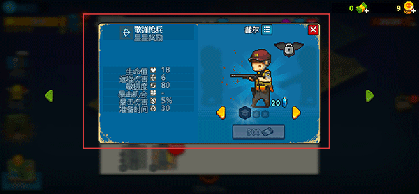 4、消耗【20】个道具和【500】金币升级【散弹枪兵】,提升其生命值和攻击力等属性增强战力。