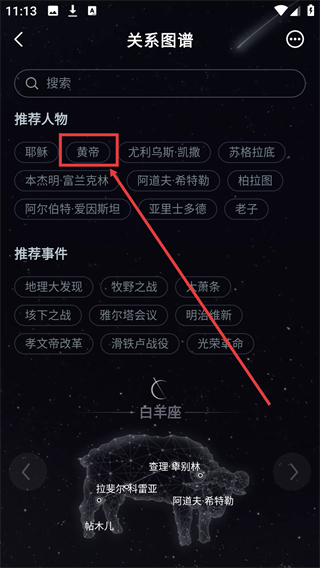 3、进入【关系图谱】后,在推荐人物栏点击【黄帝】选项,可查看该人物相关的关系网络内容。