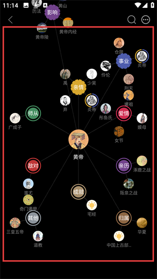 4、点击【黄帝】后,即可查看其对应的亲情、事业、敌对等多维度关系图谱,深入了解关联信息。