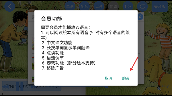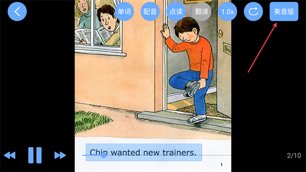 1、在绘本阅读界面的右上角,找到【美音版】按钮并点击。