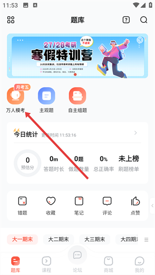 1、打开医考帮,在题库页面点击【万人模考】选项呢。