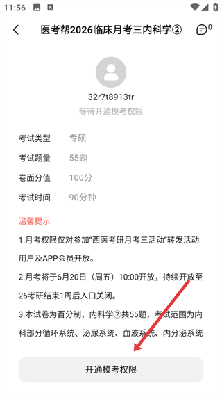3、在模考详情页,点击【开通模考权限】按钮哦。