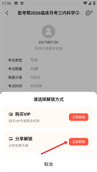 4、在解锁弹窗选【分享解锁】,点击【立即解锁】免费刷题啦。