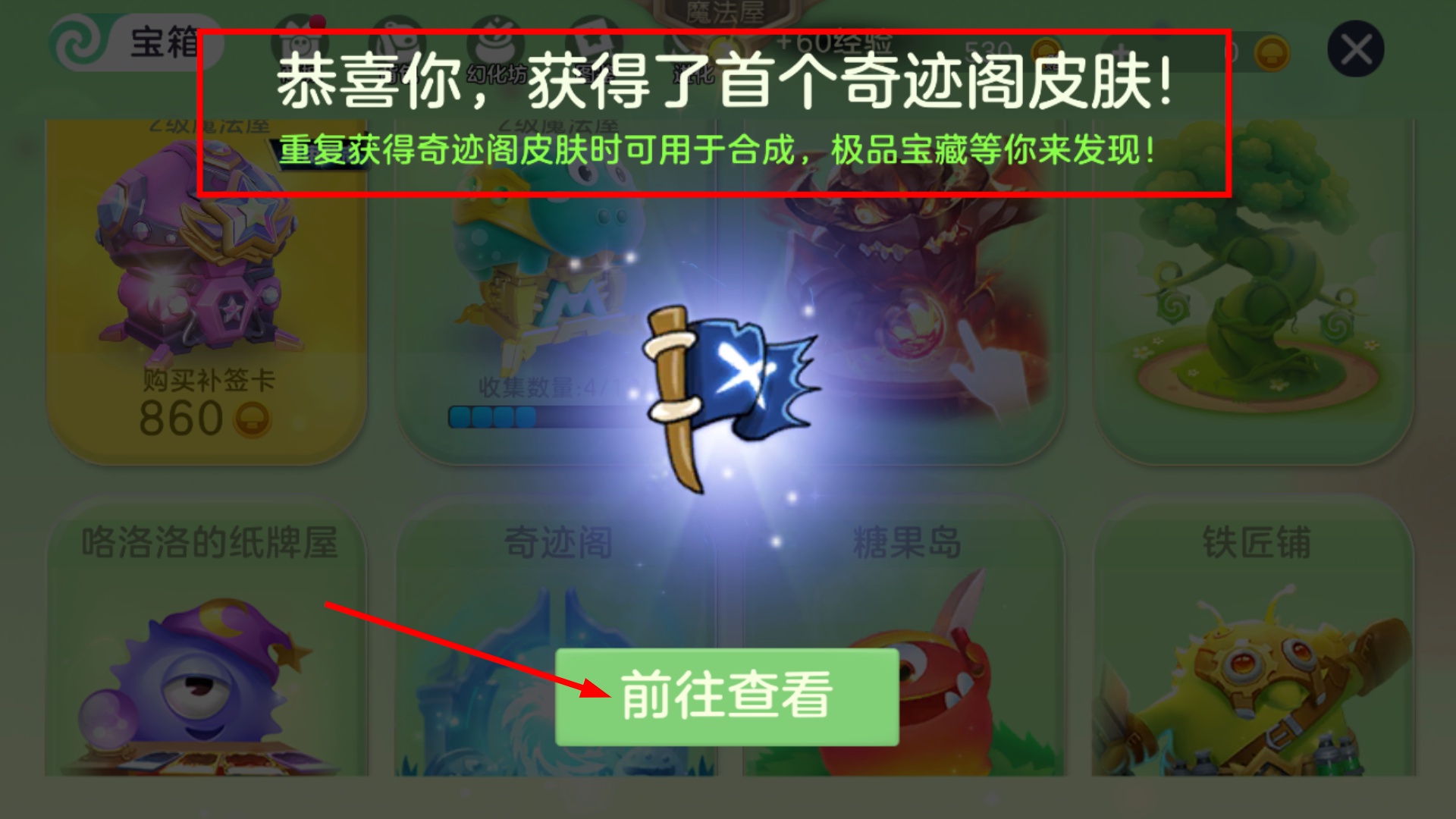 1、获得首个奇迹阁皮肤后,可点击前往查看详情,重复获得的皮肤还能用于合成极品宝藏。