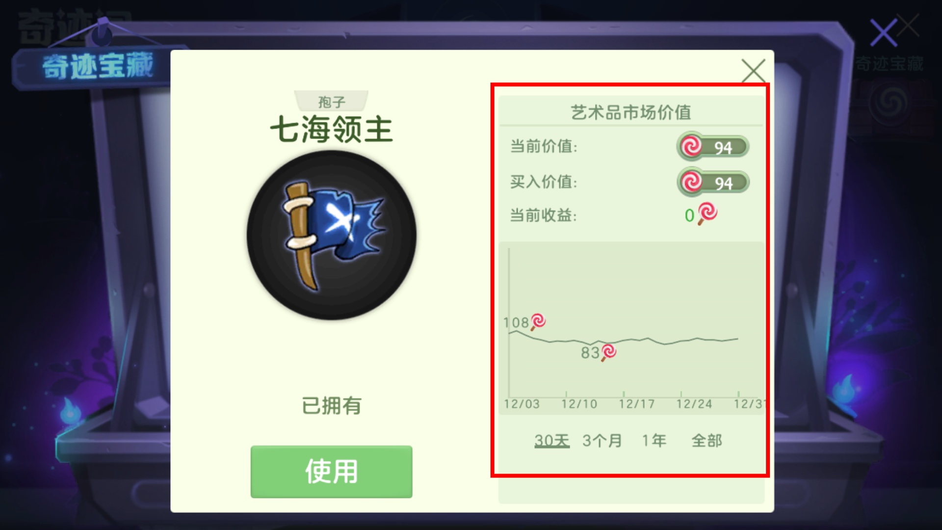 2、查看【七海领主】的艺术品市场价值,【当前价值-94】【买入价值-94】,还能看【30天】内的价值趋势。