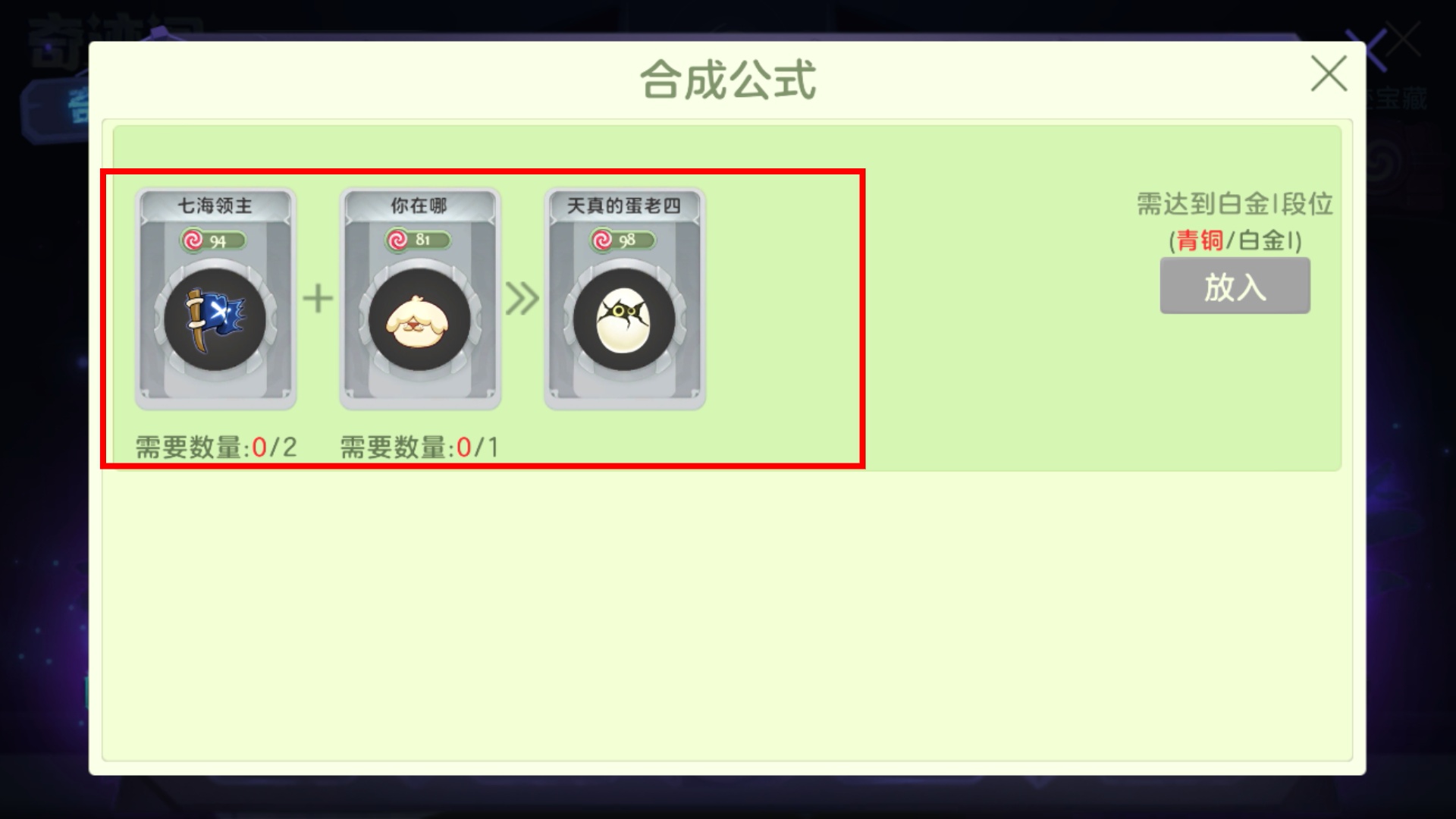 3、合成新物品需集齐【七海领主-94】【你在哪-81】【天真的蛋老四-98】三种材料,且需达到白金1段位。