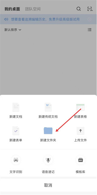 3、在功能选择菜单中,点击【新建文件夹】选项。