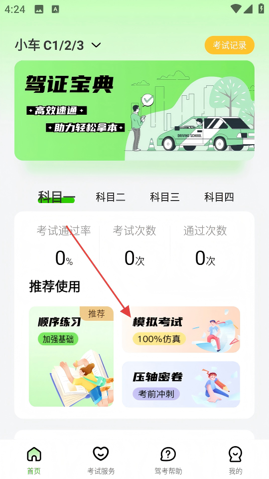 2、在主界面点击【模拟考试】,进入模拟考试选择页面。
