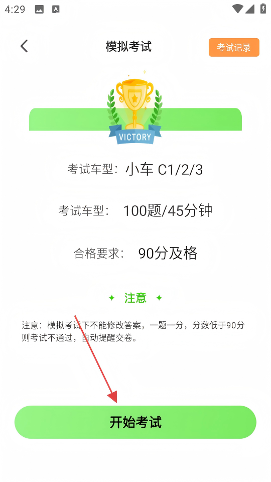 3、在模拟考试页面查看考试规则后,点击【开始考试】。
