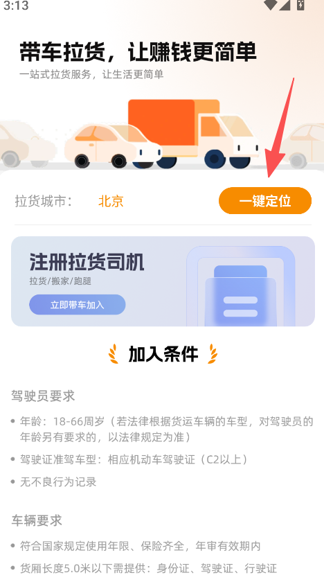 1、点击一键定位选择拉货城市。